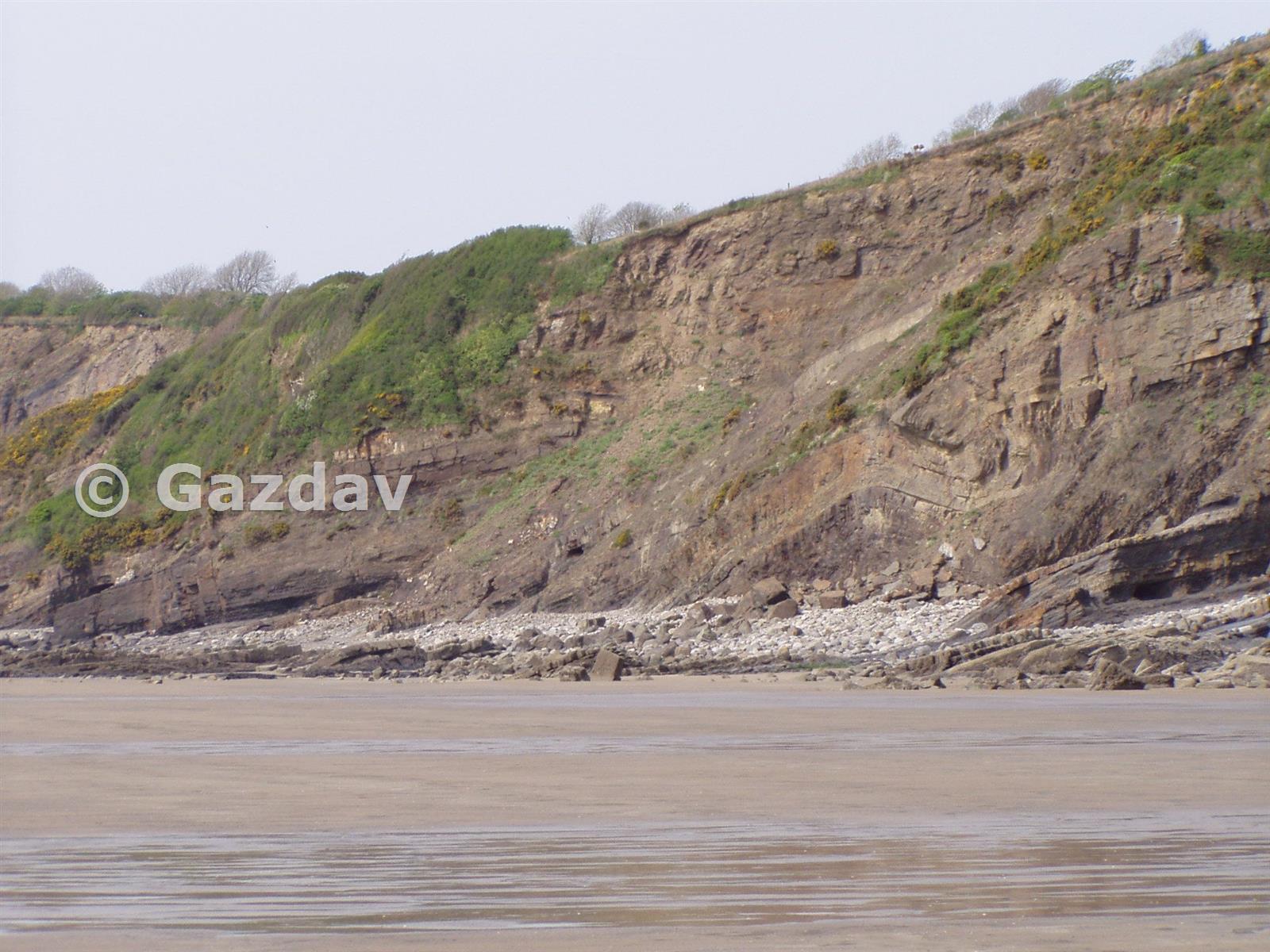 This view shows the extent of the Crickdam Patch. Crickdam mine yard is to the left. From there to the right the cliff is scarred by man. The steps in the cliff are from iron ore extraction and are only now being naturally eroded by the tides.