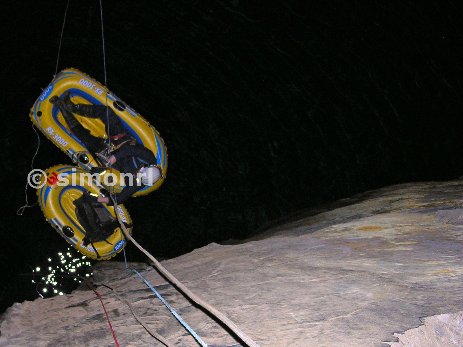 Abseiling into dinghies in Croesor chamber A17E. Croesor Slate Mine 30/05/2009