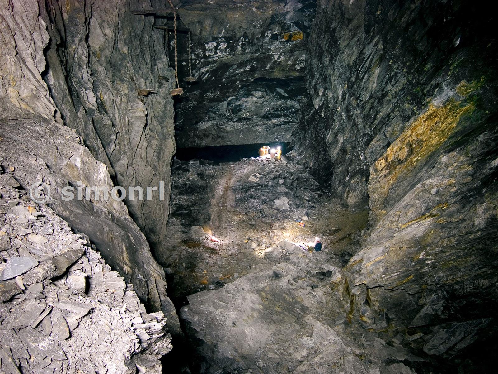 Looking down at the group in chamber A3E. Support for side bridge visible to the left of the photograph. Croesor Slate Mine 30/05/2009