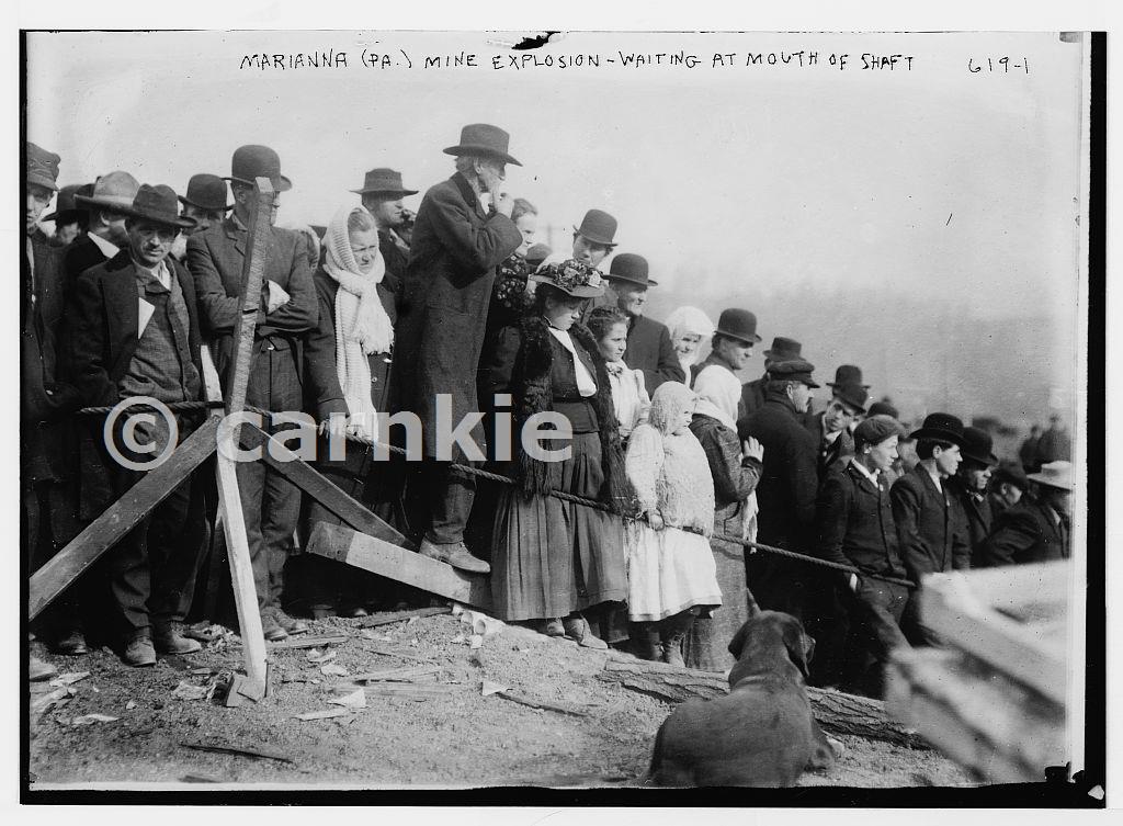 Crowd waiting at mouth of shaft