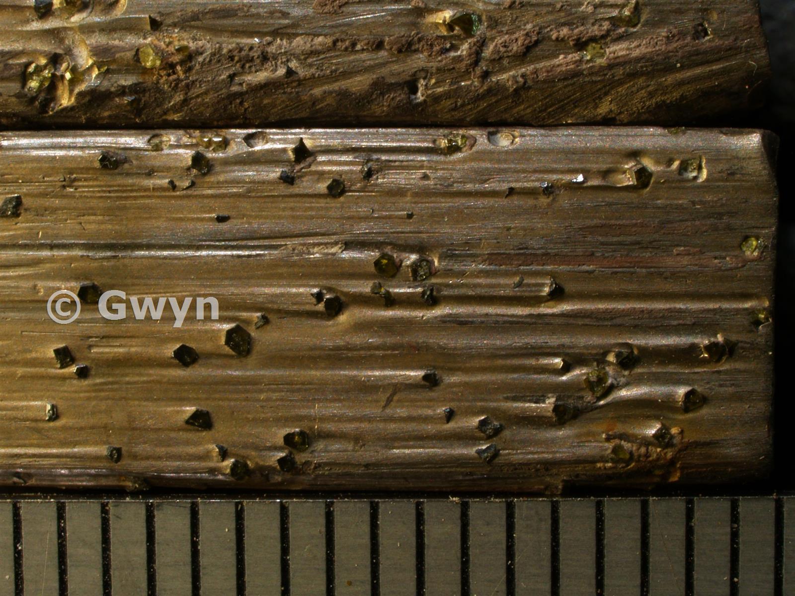 Diamond cutters/segments off large diameter, industrial saw. Scale is 1mm divisions. Macro.
