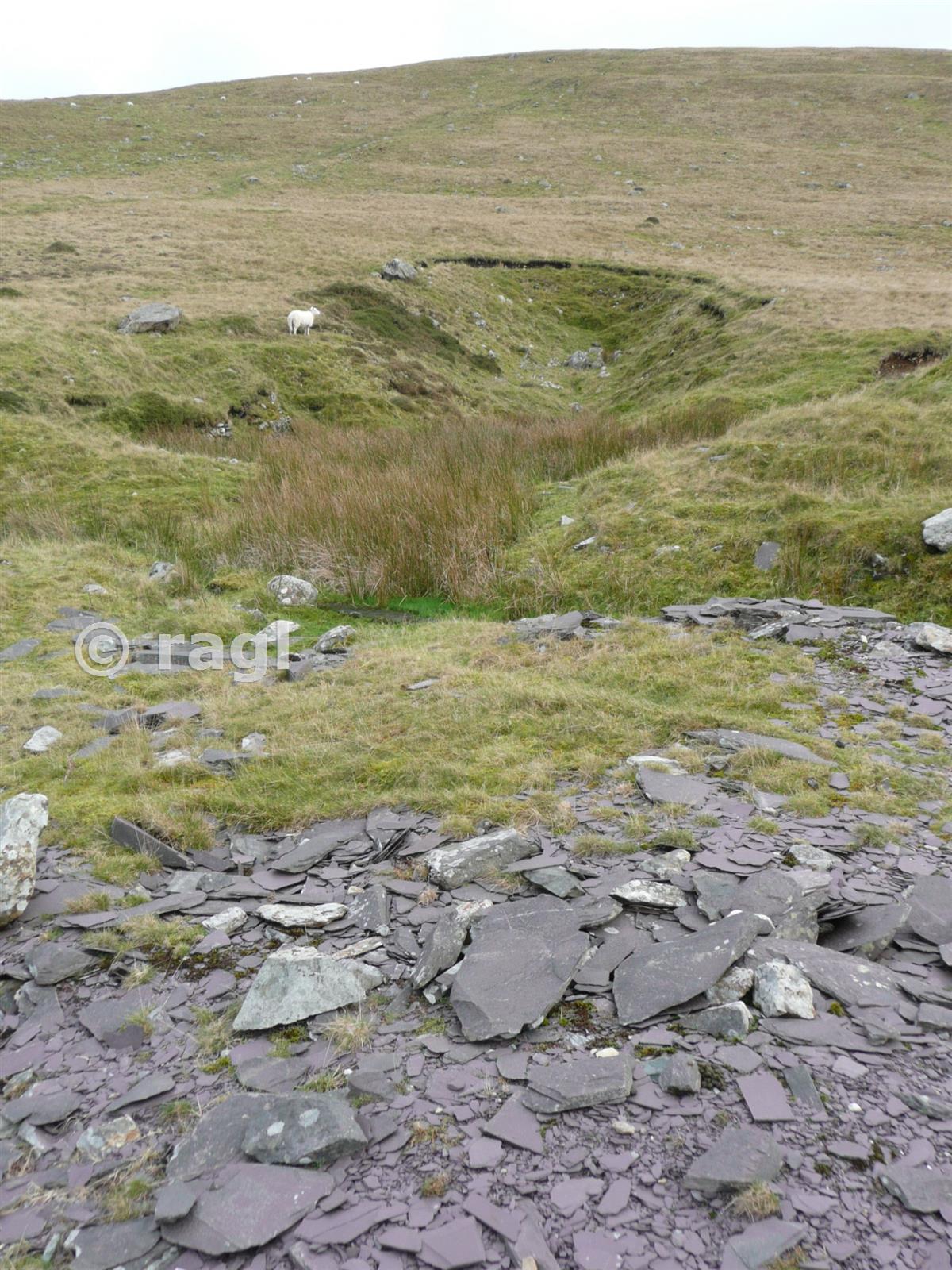 Cutting in the middle foreground leads away from the filled in adit from the quarry in the mountain behind.