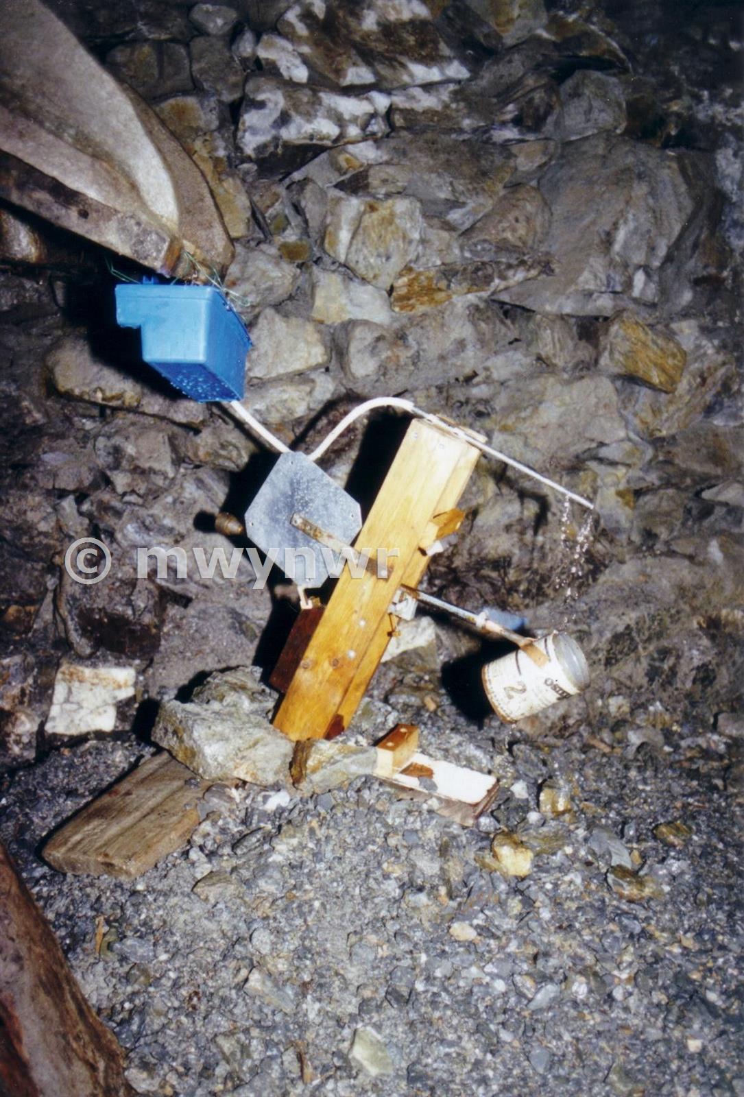 Side view of the "bell". Showing the (blue) header tank, the water supply pipe and the collecting tin.