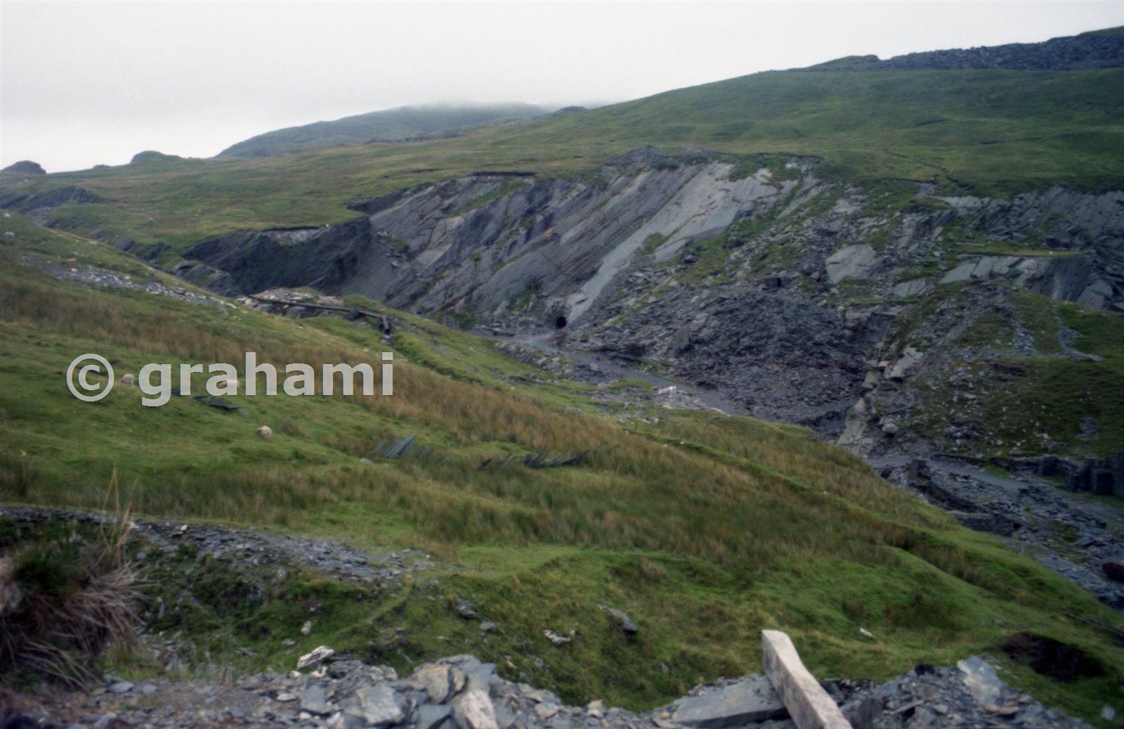 One of a sequence of shots from just beside the Rhiwbach incline looking roughly southwards. The level visible in the open quarry led to the so-called "Mill Floor" underground level round the back of the open quarry via the old "Mill Floor Incline" and connecetd with the short level between the mills and the main Back Vein Incline.