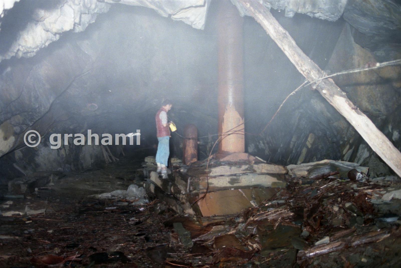 A view looking the other way, with the descending pipe in the foreground. In the distance can be seen daylight, the DE floor level still being open in the quarry at this time - allbeit behind a pile of waste slabs!