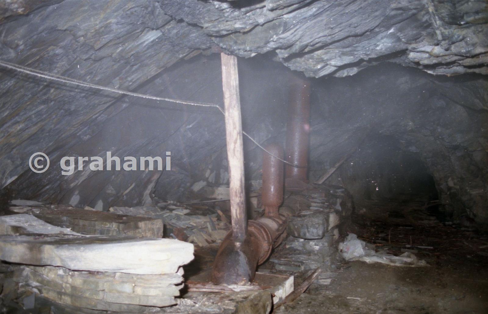 Two floors above G was the main DE floor level tunnel from the quarry to PenyBont. Variously referrred to as Lefal Galed, Lefel Coed and the Horse Tunnel, this dated back to the 1840's-50's. The turbine pipe to the G pump passed down one ancient shaft from the surface to the DE level, then bent through two right angles about 15-20 feet apart down the shaft to G floor. The latter shaft is in the foreground -note the massive timber baulk to stop the pipe moving under shock loads, in the background the pipe bends and rises again up the upper shaft.