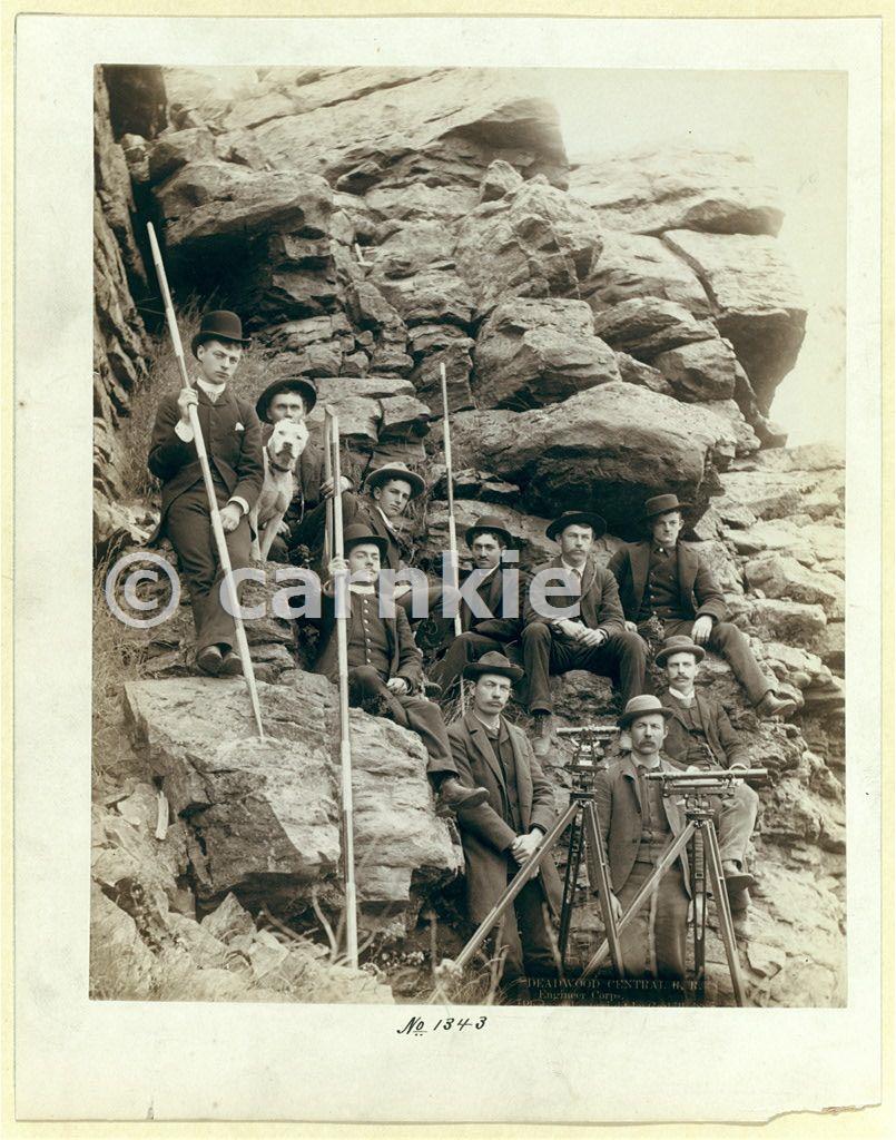 Outdoor group portrait of ten railroad engineers and a dog, posing with surveyors' transits on tripods and measuring rods, on the side of a mountain. Most of the men are sitting; all are wearing suits and hats.