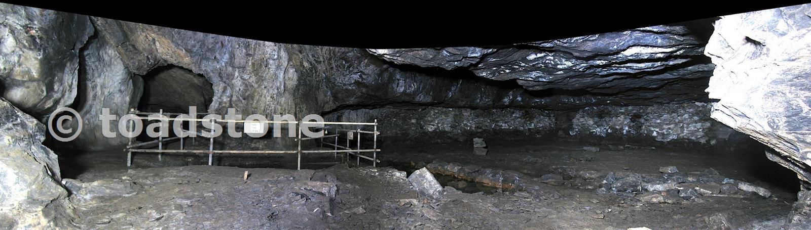This is the main shaft area directly below the Engine House seen in the aerial suface shots. The surface shaft is located just behind the scaffolded main shaft just through the opening. The area to the right of the pano shows the stacked deads.