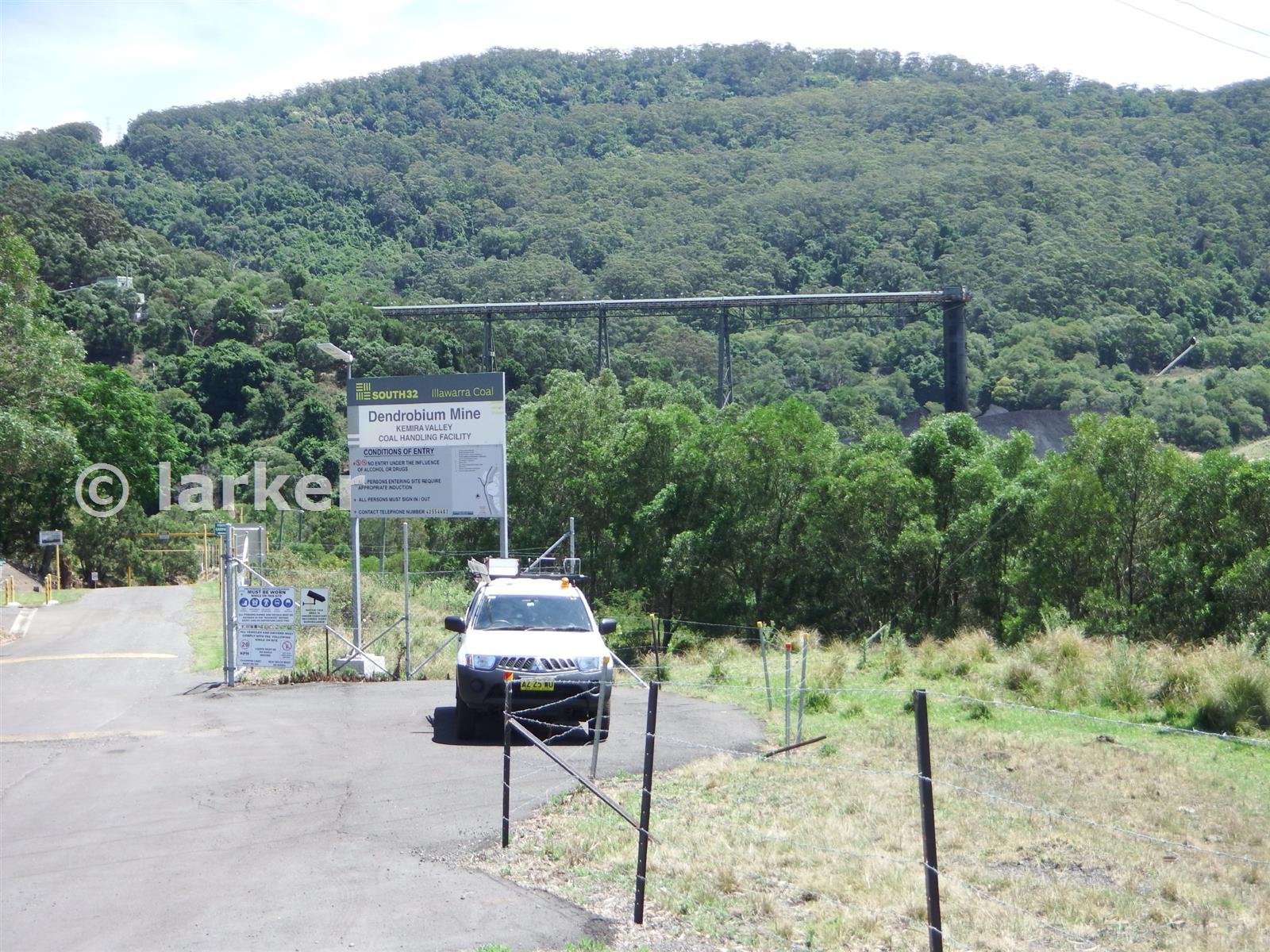 Conveyor emanating eastwards from the mine. Within the mine the outbye drift heads north west to beneath the Cordeaux reservoir catchment area. Beneath the tower at the end of the conveyor is a storage area and a rail head. Coal trains frequently move coal downhill to the near by Wollongong steel works.