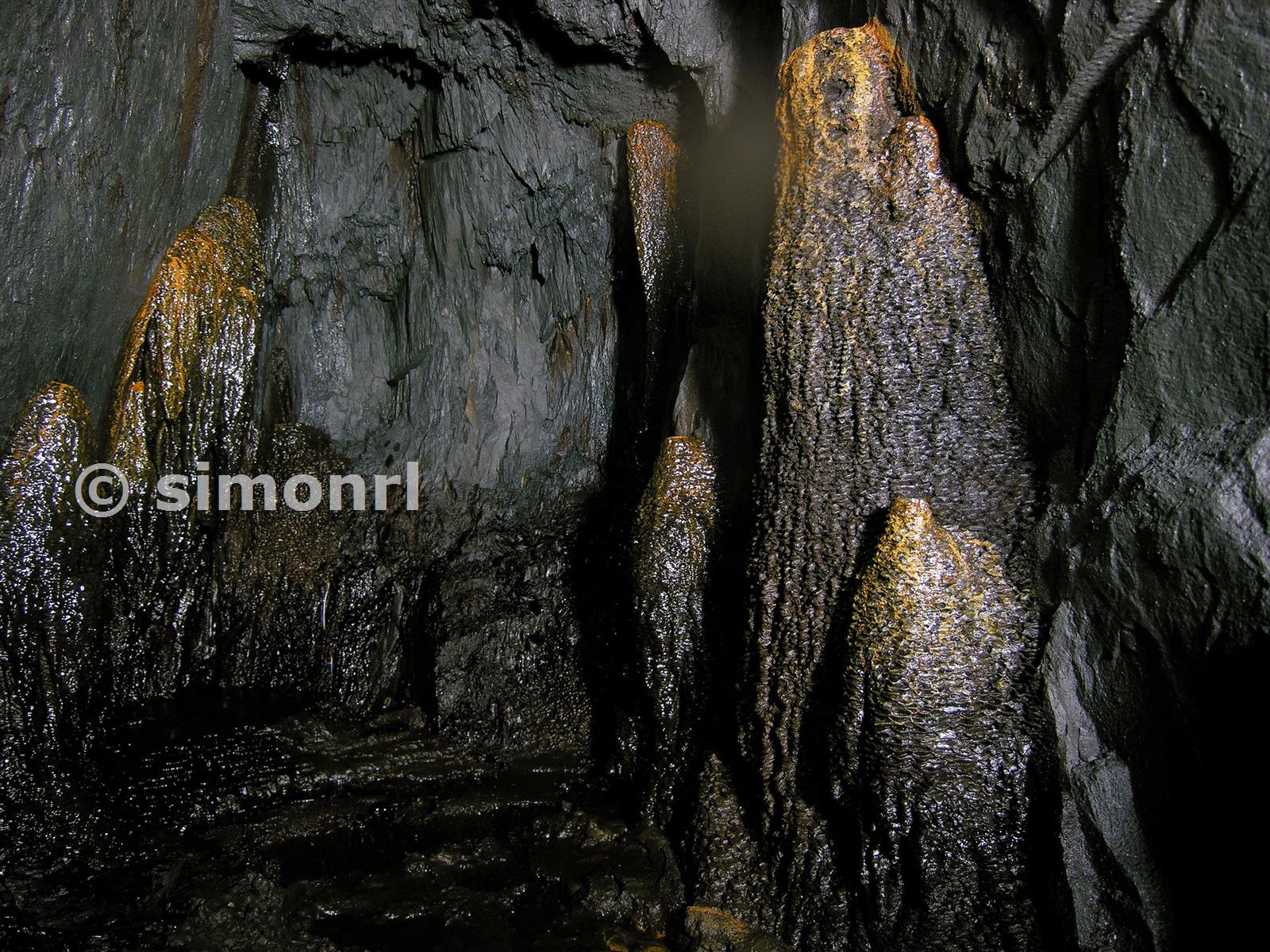 At the end of the level leading from the ore kibble are these impressive formations. Care must be taken traversing this level due to surface water concealing a false floor.