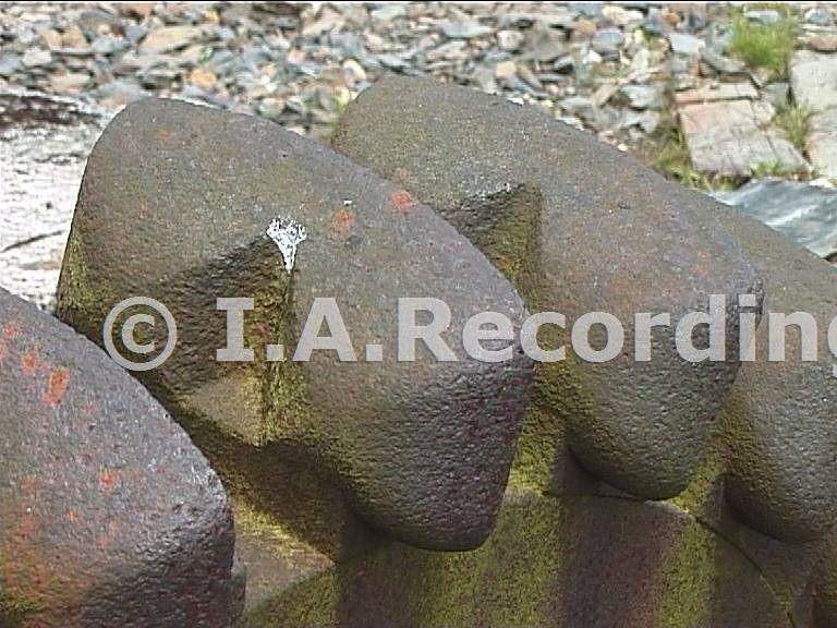Detail of the pelton wheel, part of the remains of the c1900 water powered dressing floor equipment. [Grab from 12th July 2002 video]