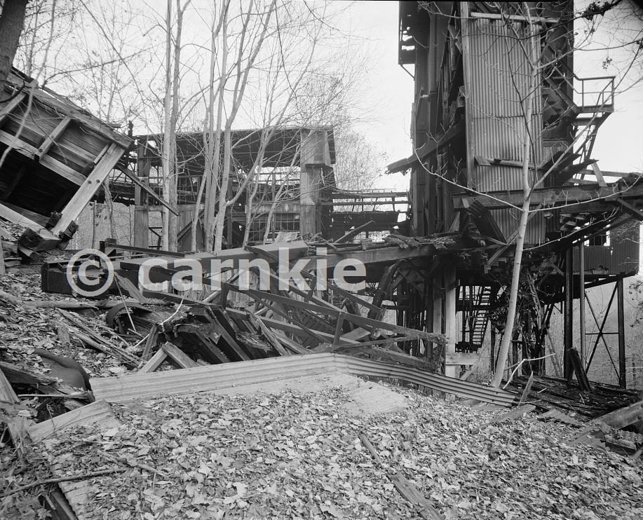. NORTH ELEVATION, SHOWING COLLAPSED MARYLAND NEW RIVER COAL COMPANY ADDITION, WITH REFUSE CONVEYOR (FOREGROUND), TIMBER REFUSE BIN (LEFT), CONVEYOR HOUSE AND SCREENING ROOM (CENTER), AND COAL STORAGE SILO (RIGHT), LOOKING EAST. Courtesy Library of Congress, Prints & Photographs Division, HAER, Reproduction number HAER WVA,10-LOUT.V,1F-4