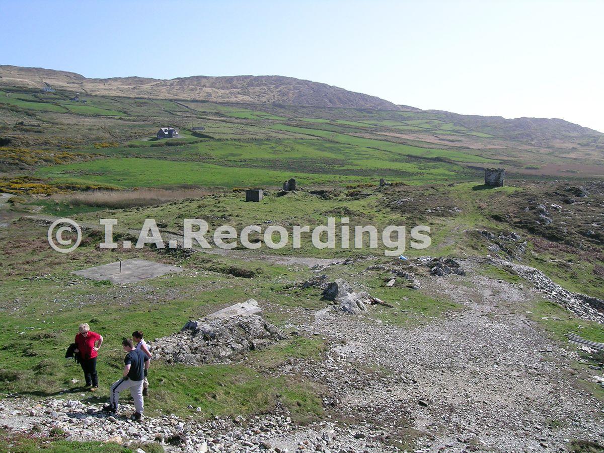View across the site with capped shaft and remains of the dressing floor (foreground) and possible miners baracks or housing in middle background and powder magazine on right.