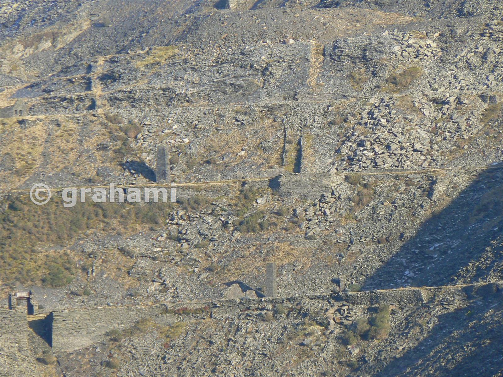 The two visible chimneys are for the Floor 0 (lower) and Floor 2 "Alabama" mills. To the right of the Alabama Mill chimney, just above the Floor 0 Mill chimney, you can see the beds of the old inclines to Floor 2 from floors 3 and 4.
