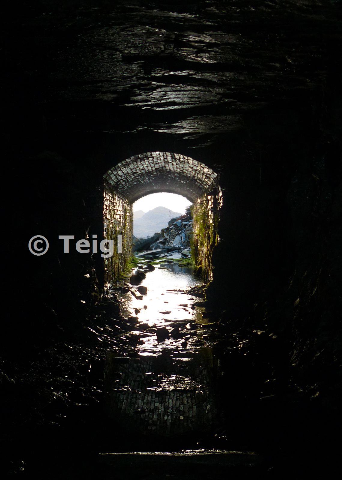 The first few yards have a fine corbelled roof and a view out to the Moelwyns...the tunnel ends after only a few yards, blocked off by concrete and with three water pipe outlets and tap wheels.