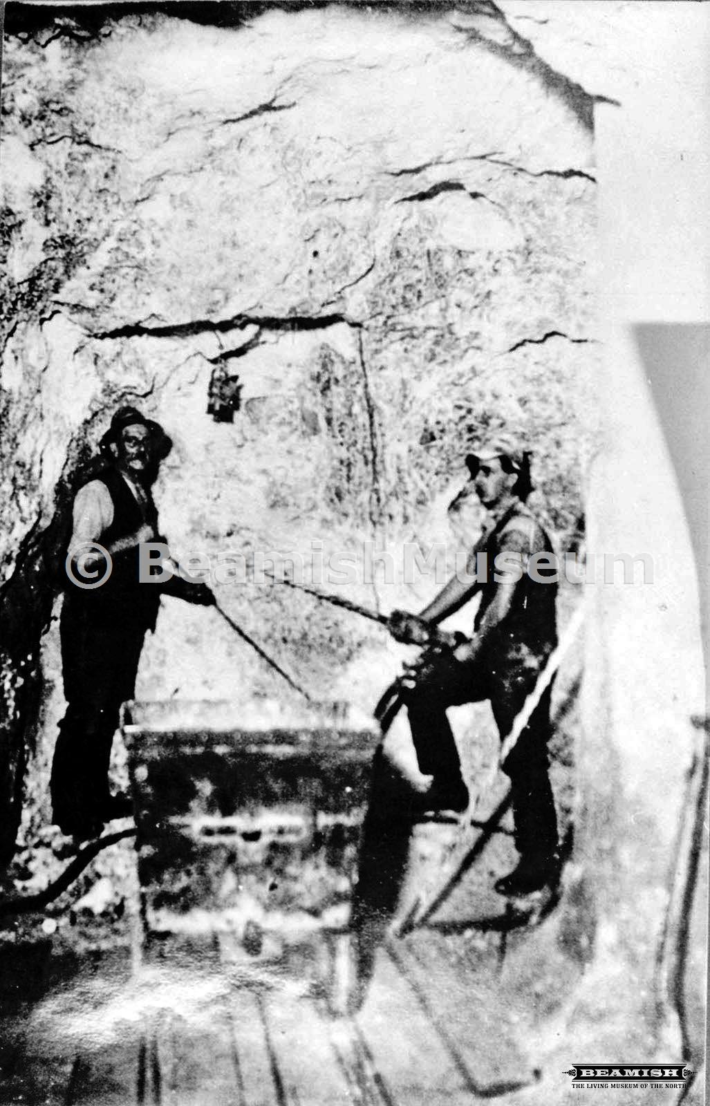 Tom Cawkwell (left) and son Harold drilling in fore end, Settlingstones Mine. Date:c1930, from the Beamish Museum Photoarchive