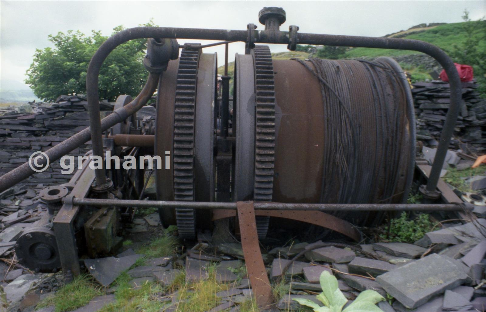 On the left is the traversing rope drum, on the right the hoisting rope drum. The brake bands lie twisted in front.
