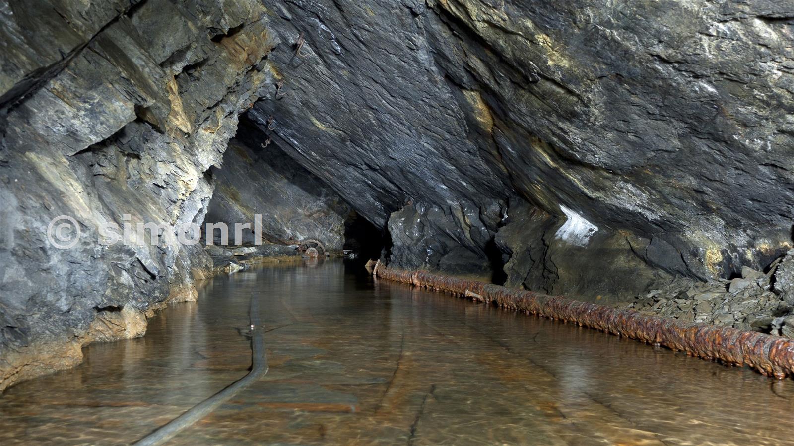 The new scaffold pipe causeway, E floor, back vein. Cwmorthin Slate Mine June 2012