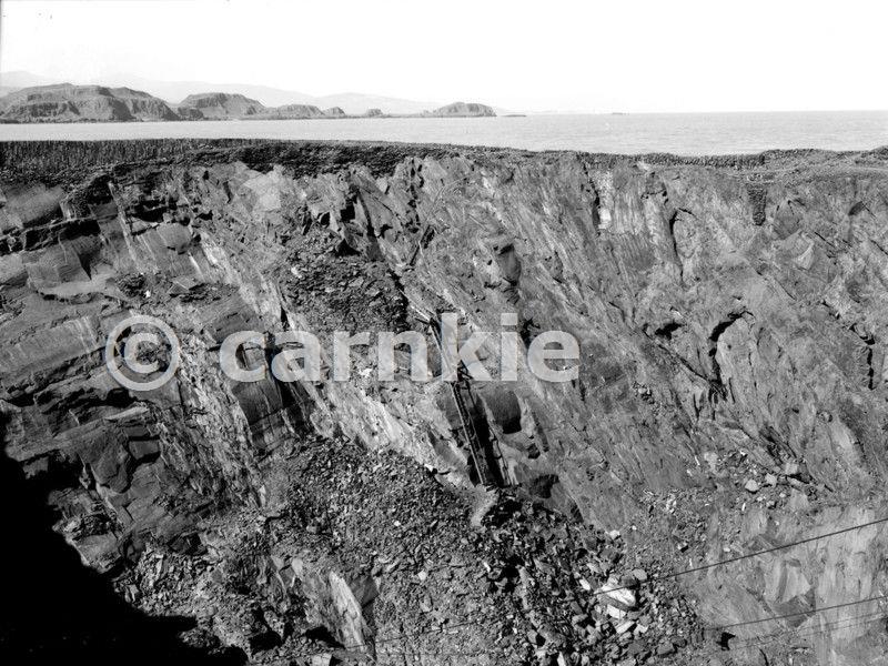 Easdale Island. Argyllshire. Easdale Slate quarry in 'Black Slate Group'. A view of the quarry face showing means of access for the quarrymen - a series of ladders stretching down the face. The cleavage dips steeply from left to right, and the bedding is almost indistinguishable. The Black Slate Group is of Dalradian age. The Easdale Slate belt extended from the north of Jura, through the islands of Scarba, Belnahua, Luing, Shuna and Easdale to Seil and then northwards to Oban - a distance of 20 miles. Photo P000011. Reproduced with the permission of the British Geological Survey ©NERC. All rights Reserved.