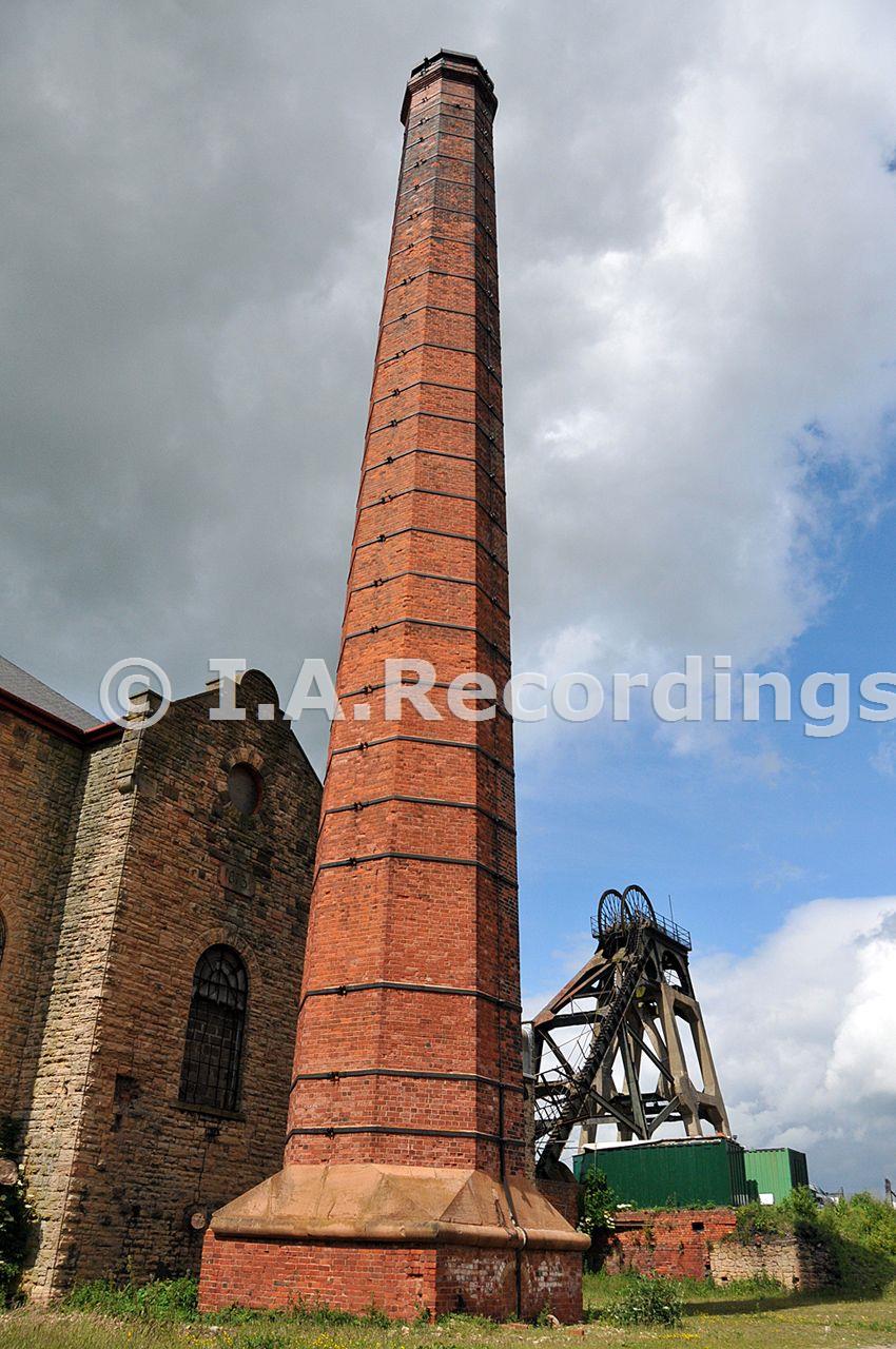 South engine house East wing and East red brick chimney - the West chimney has not survived pit closure. North shaft headframe in background. Taken during the NAMHO 2009 Conference visit to Pleasley Colliery, more details on their web site www.pleasley-colliery.org.uk
