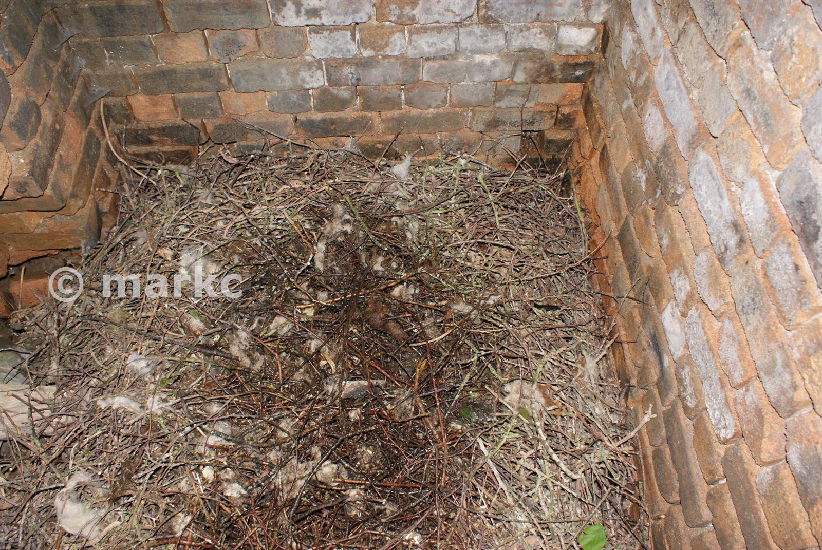 Looking inside the chimney base. Nesting material that has fallen down the chimney.
