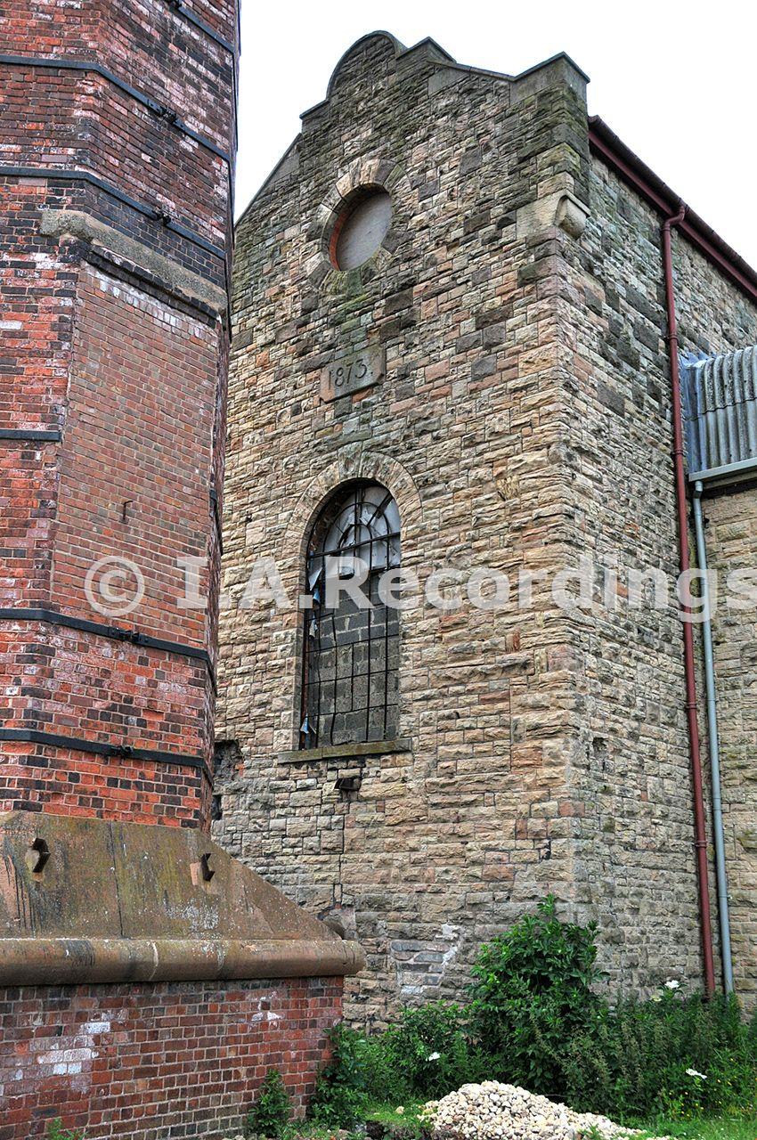 South engine house East wing gable, with 1873 datestone. The red brick chimney (left) is the surviving one of two. Taken during the NAMHO 2009 Conference visit to Pleasley Colliery, more details on their web site www.pleasley-colliery.org.uk