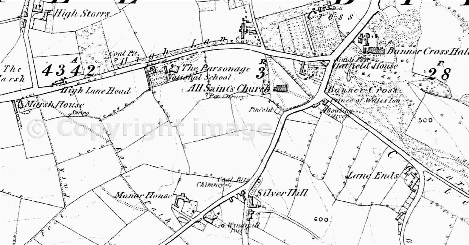 Extract from the 1850 Ordnance Survey map showing coal pits at Silver Hill on Ecclesall Road. Another coal pit is shown to the NE between High Storrs House and All Saints' Parsonage adjacent to High Lane (now Ringinglow Road).