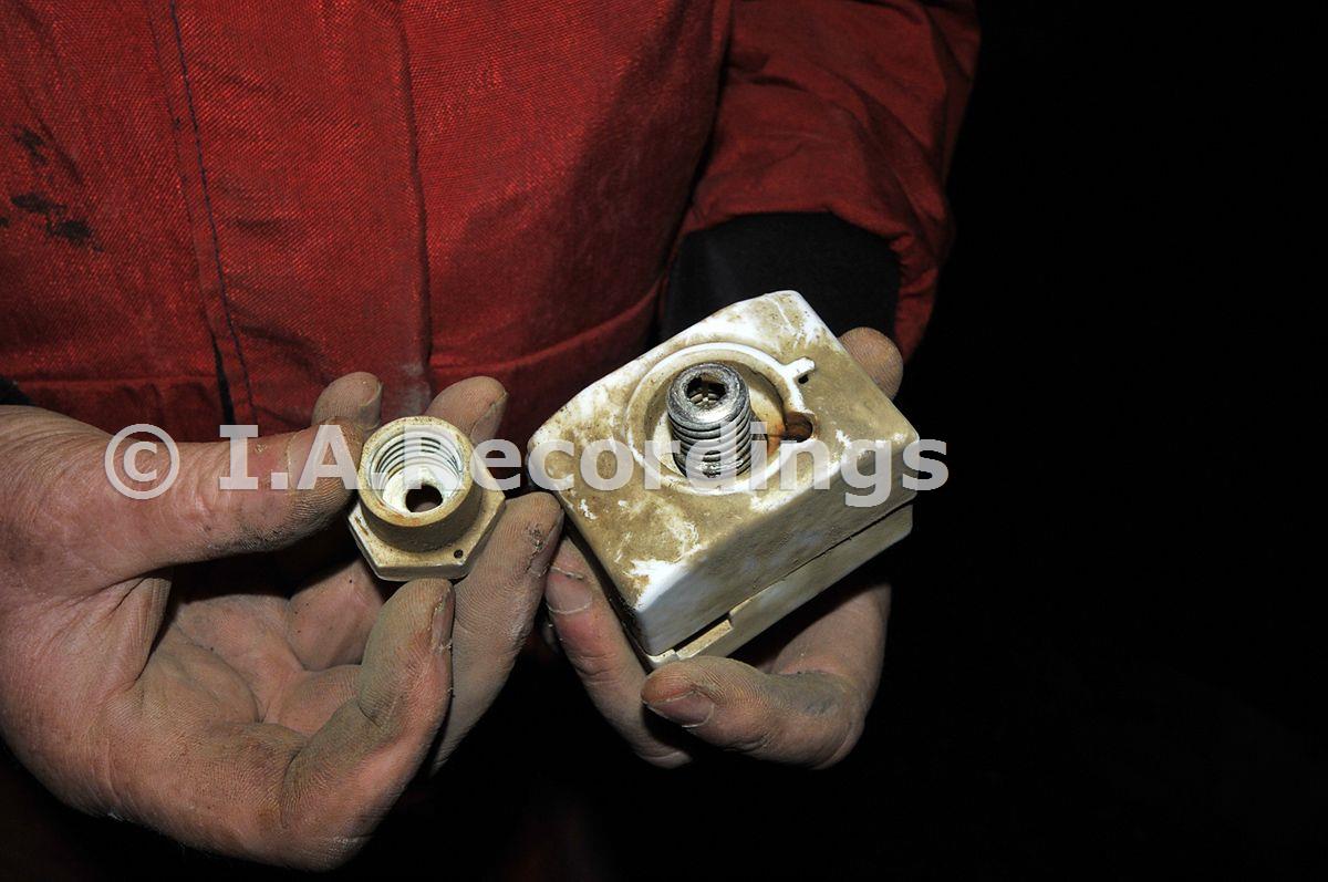 An electrical connector found on the floor of the Man Engine chamber (South East & West Lode), Main Adit. [October 2012]