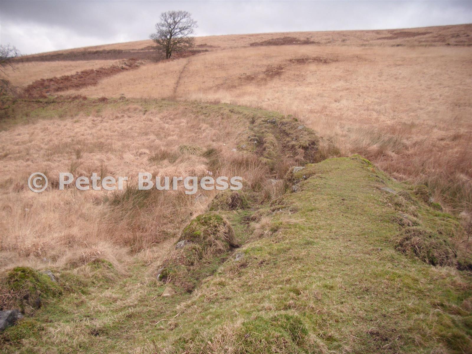 The line of the tramroad is very clear where it crosses rough land and a small stream north of Henrhyd.