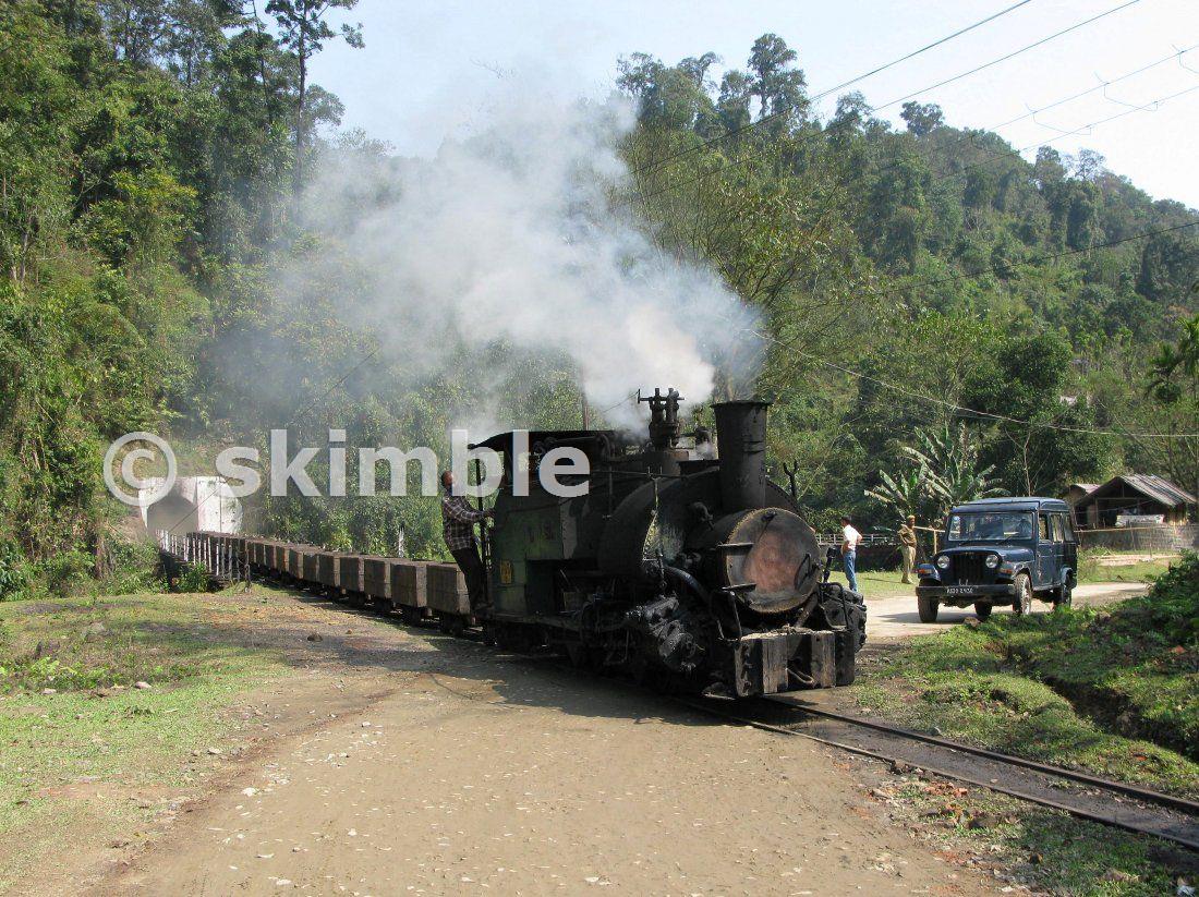March 2008 The train emerges from a short tunnel and crosses a river bridge and road. The loco is no 789, built by the North British Locomotive Co in 1914, transferred from the Darjeeling Himalayan Railway c1970.