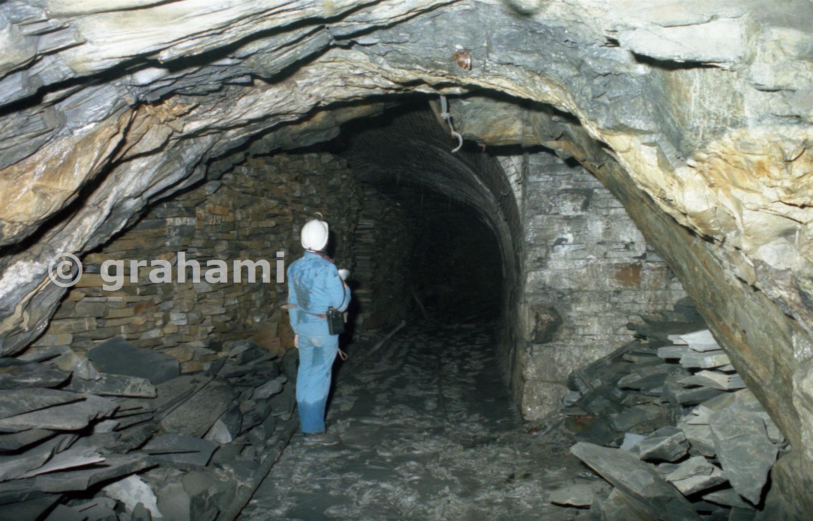 This is looking South from the "solid ground" into the Archway. On the immediate right is a half blocked level. This leads into Chamber A1 (no, don't ask!) In 1870 this was the site of an Incline from H floor up to G. At the same time as the arches were constructed a retaining wall was built in this chamber to the roof so as to keep it open and a zig-zag slab stairway made down the old incline bed from G to H.