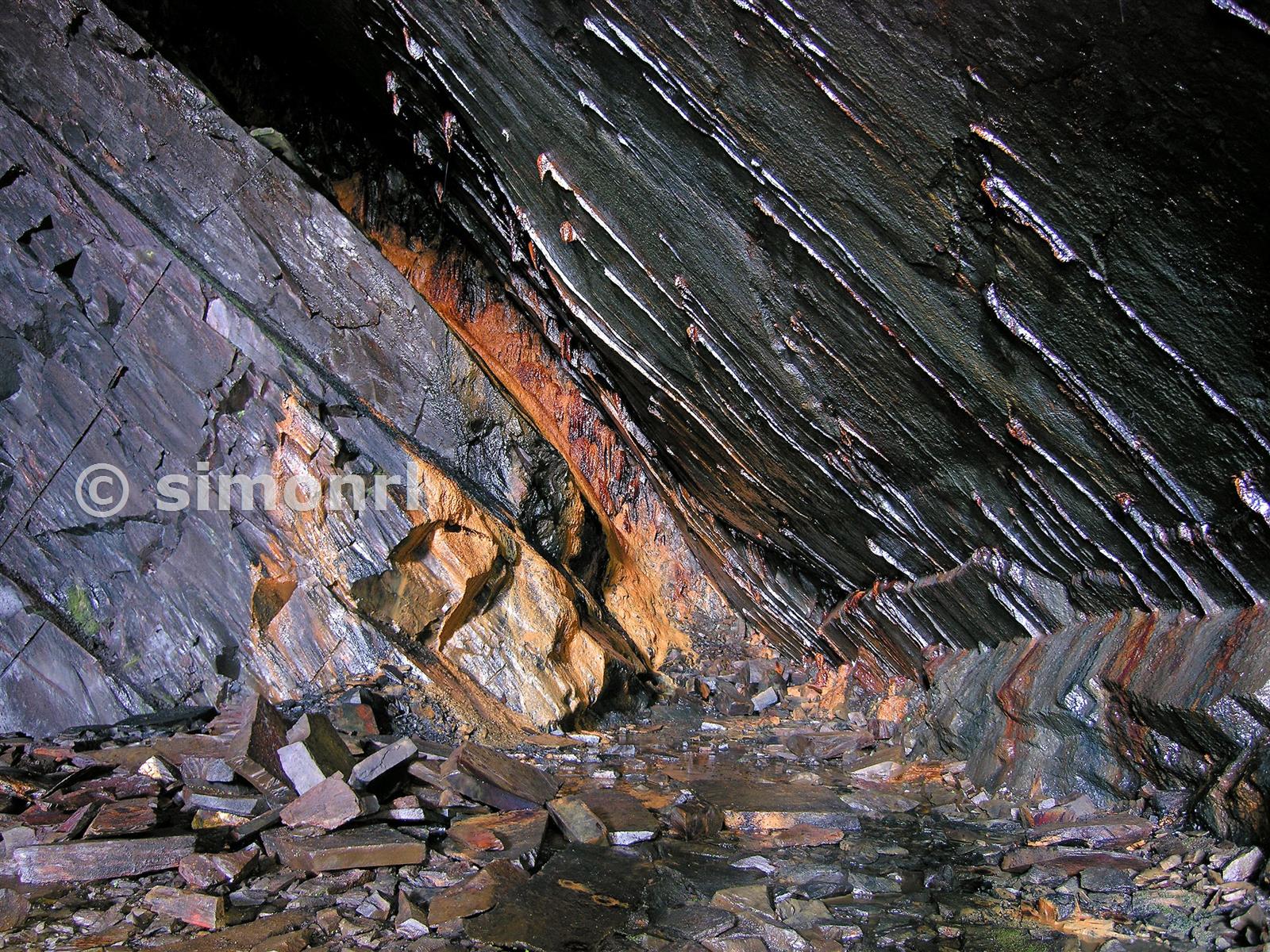 Extremity of the one of the upper floors at Clowgyn y Fuwch, there is a man way at the top of the slab to a higher level we did not explore