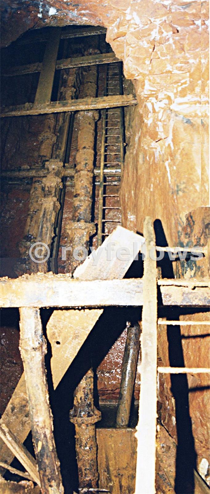 About 1996 there was a massive fall in Endeans shaft which not only took away all of the ladders and other shaft timberwork but also blocked the shaft at the 24 fathom level. This was so severe that it raised the power take of bob for the power train to new shaft by 8 inches off the floor. This photograph is actually 2 vertical shots joined together in Photoshop, technology that was not available when they were taken! It shows the shaft before the fall.