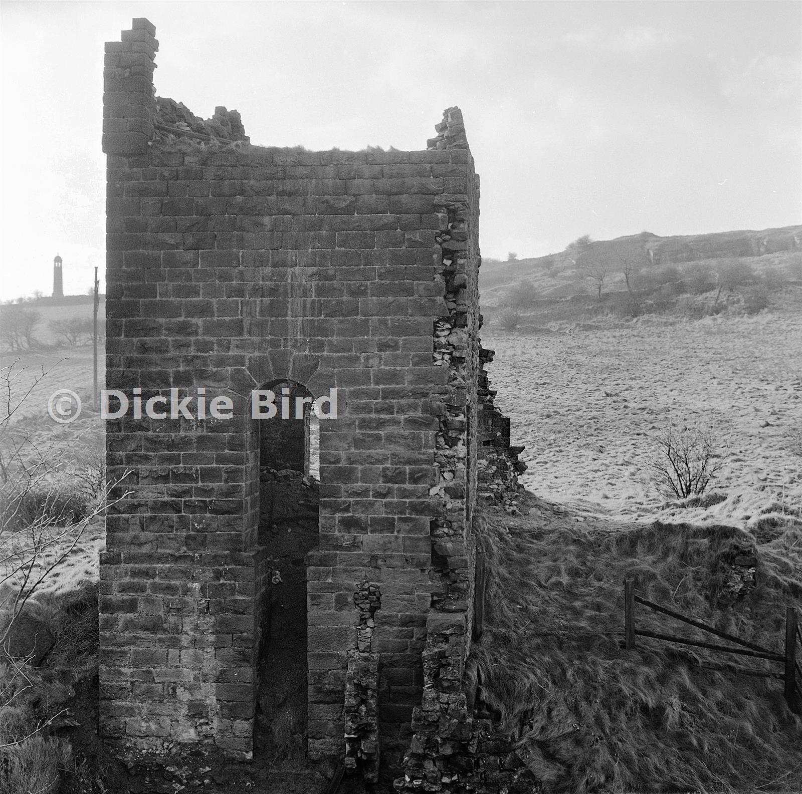 View of engine house across the cratered shaft, taken 1968. Today, nothing remains here, the engine house having been demolished and most of it thrown down the shaft.