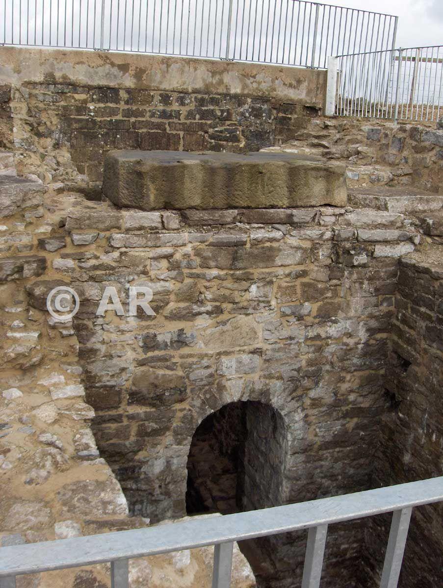 The engine house bob wall, with an arch going through into the condenser pit. The large block is a bob counterbalance weight which the conservation team forgot to move before they emptied the engine pit...