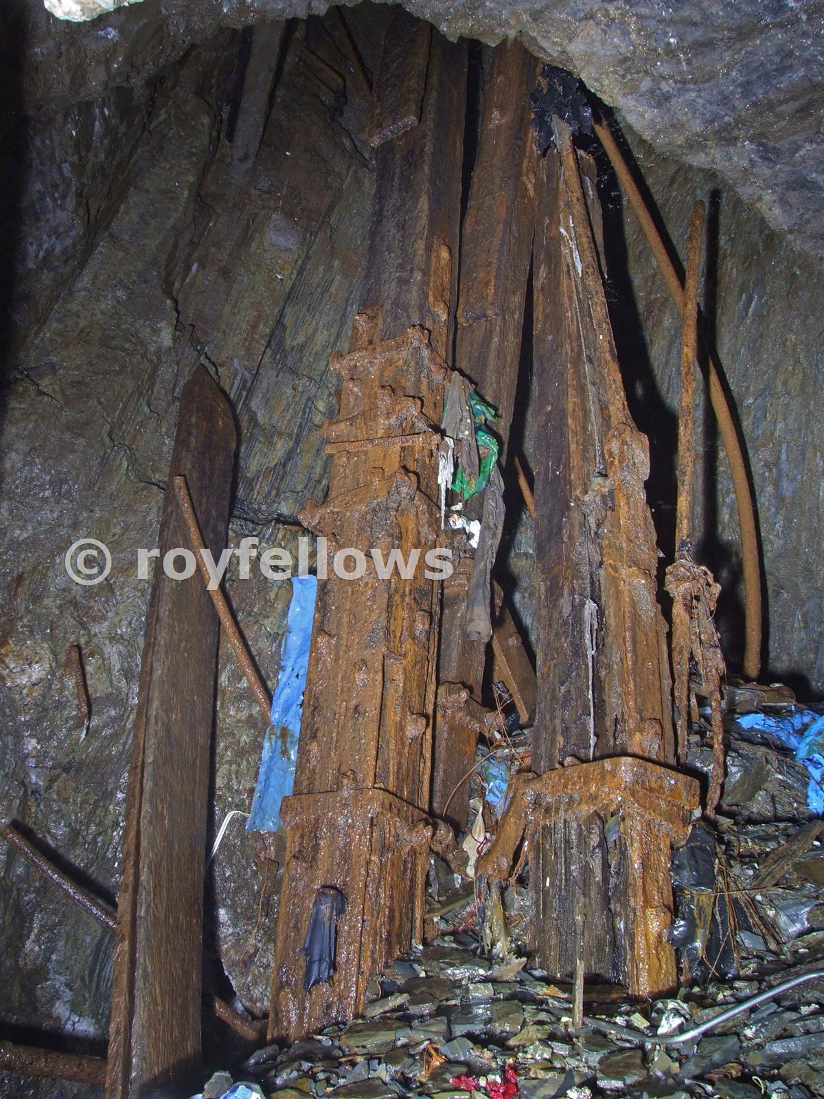 Compare this with the archive photo from the 1990s. I have tried to figure out the many pump rods, one theory is that failed rods were pushed to one side and secured rather than being removed. Another is that we are looking at rocker beams dragged down the shaft when the pump rod was released at the time that the beam engine was dismantled for scrap. This was a common practice.