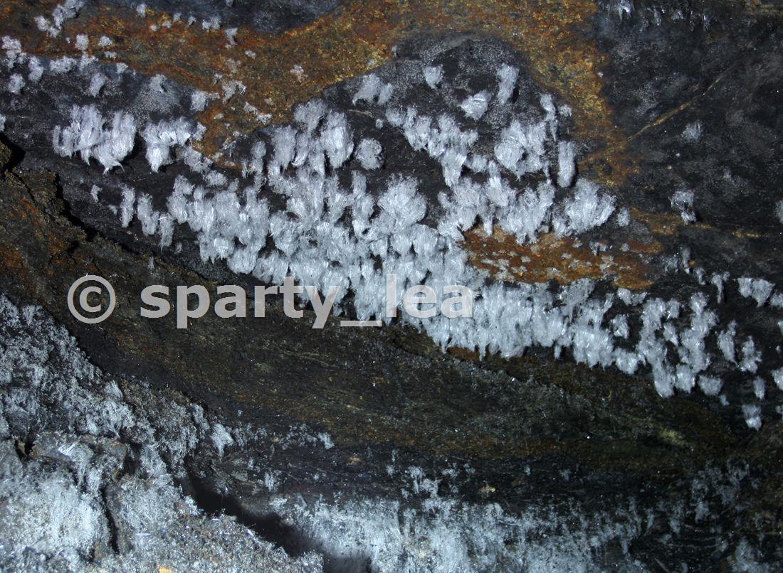 Epsomite crystals hang down like tufts of fur from the shale roof.