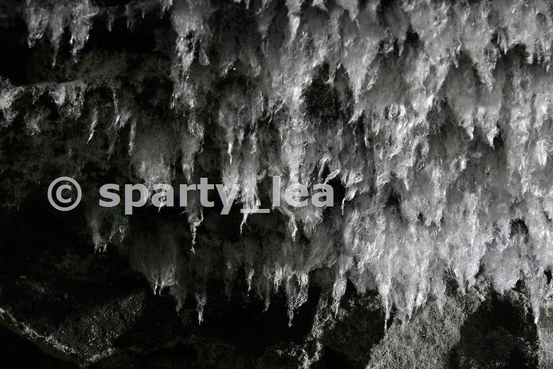 Fragile, hair-like crystals of magnesium sulphate (epsom salts) growing from the roof in the flats.