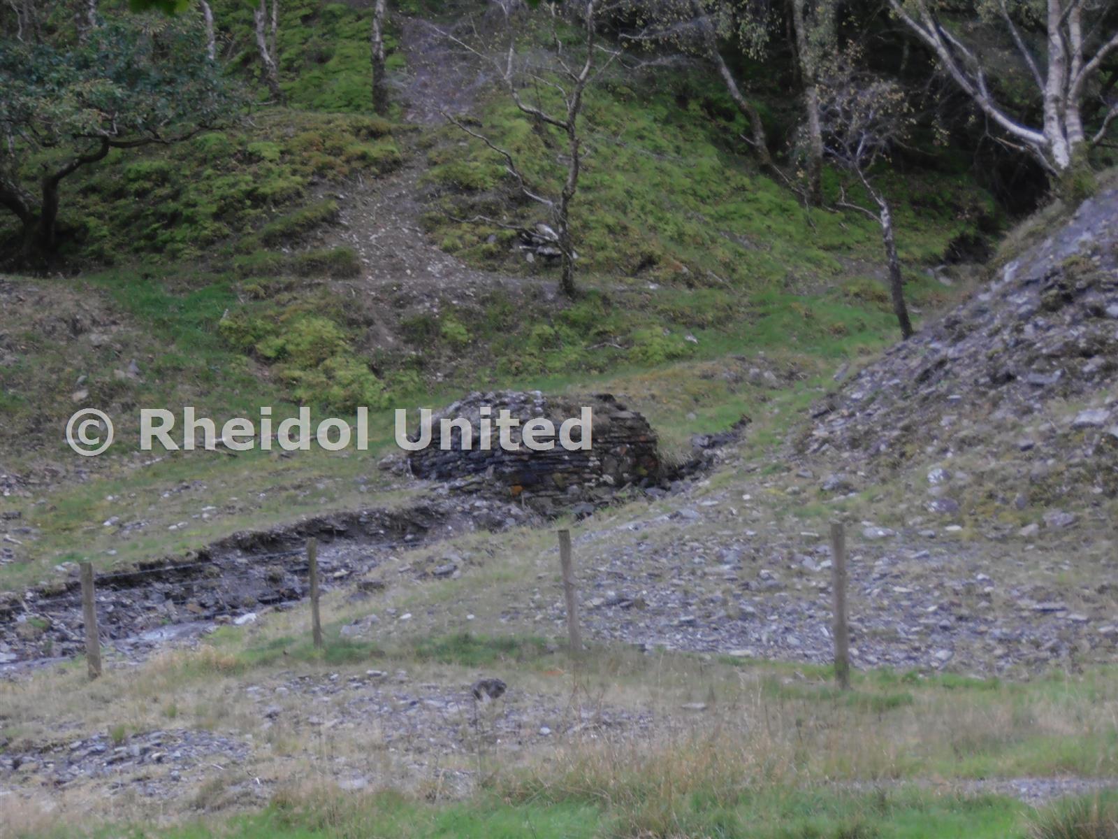A closer look at the possible pillar. Past it flows Nant Rhugos that created the ravine above.
