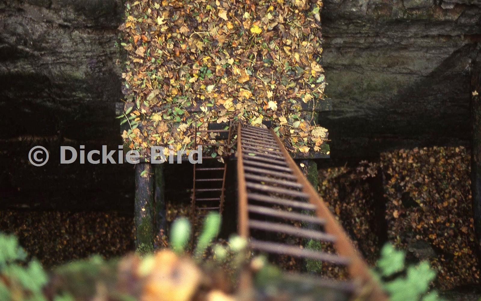 A poor shot but one never to be repeated. Once the emergency exit to the mine via ladders and sollars. The whole vein here is now filled with modern mine processing waste