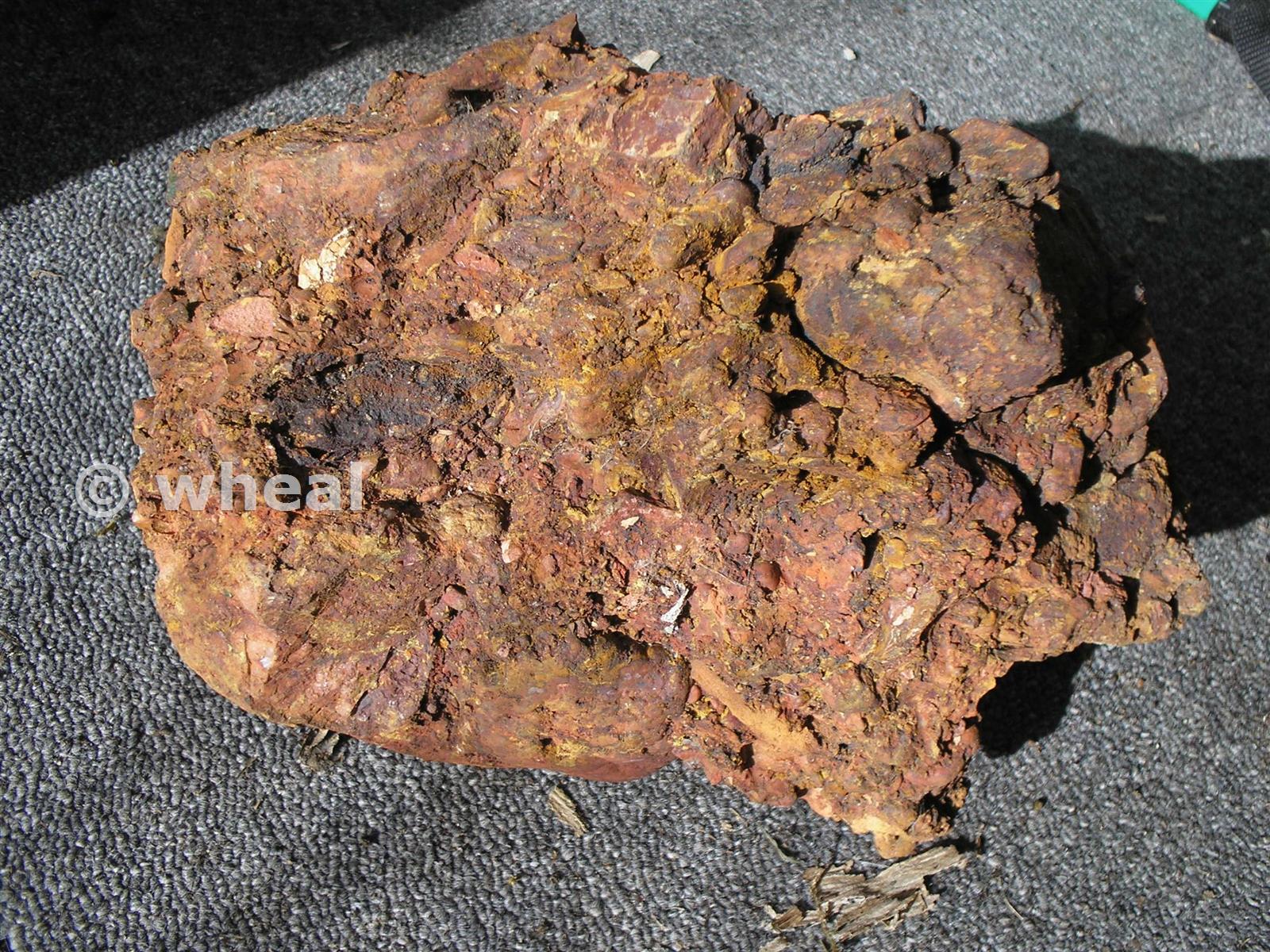 Lump of material identical to that removed from the workings. It comprises well rounded pebbles and sand fixed by iron/manganese oxides.
