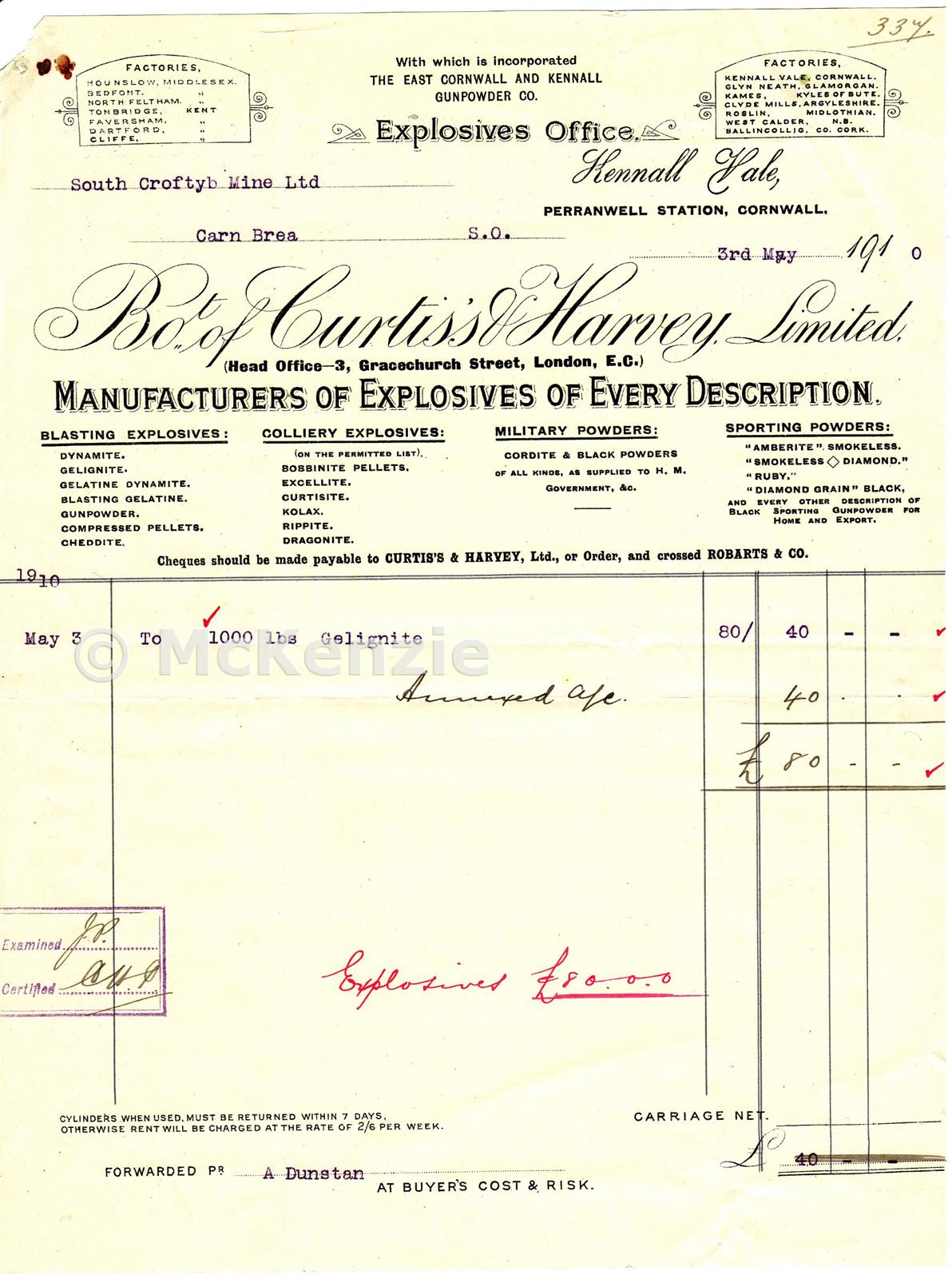 An invoice from Curtis's & Harvey Limited dated 3rd May 1910 for 1000lbs of Gelignite.