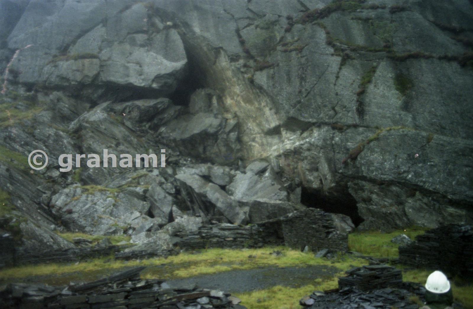 This happened while we were on site in atrocious weather. The side of the outcrop fell above the adit. You can see the sheep just above it which seemed somewhat stunned that the bit it had been walking on collapsed!