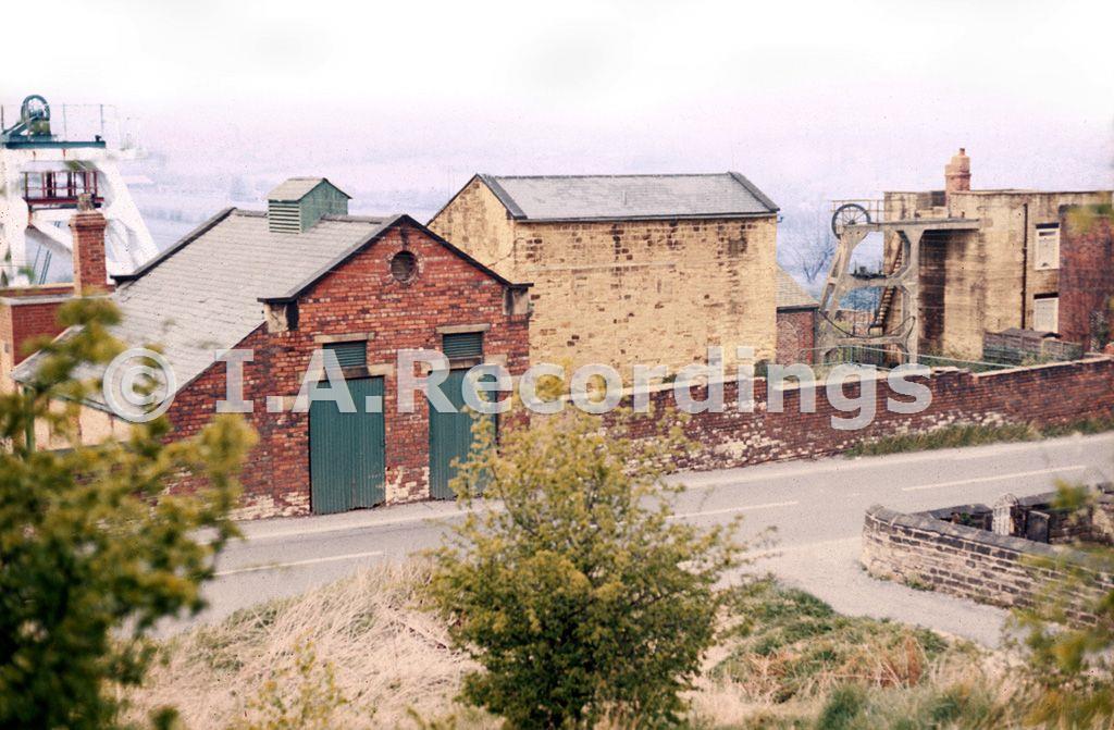 Hemingfield Colliery (Elsecar Low Pit), brick ventilation fan house on the left, South and North engine houses centre and right, 6th May 1984. (Scanned from a damaged slide, image restored as much as possible in Photoshop).