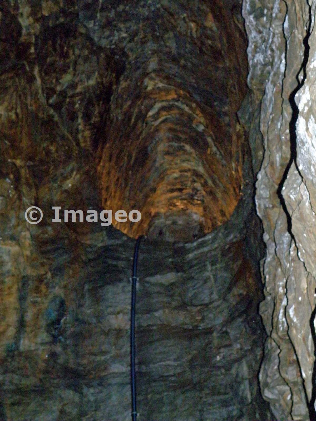 The distinctive egg-shaped cross section of a fire set acces cross-cut is shown. The Skuterud mines were largely developed by fire setting and there are some excellent examples of the end product of the method.