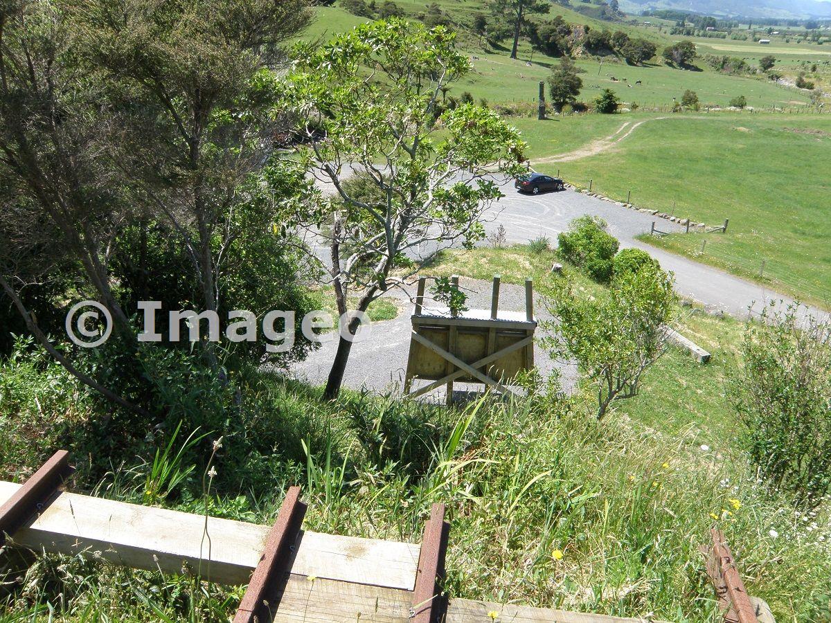 The restored part of the tramway above the old battery site. The rails formerly extended from here on a trestle to the feed hoppers of the original mill.