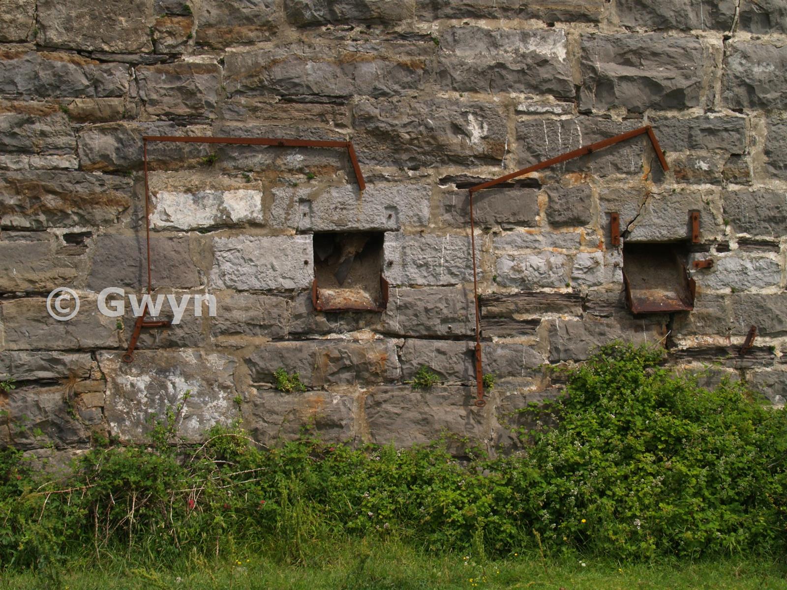 Detail of stone work of storage bins and mechanism for chute control. July, 2009.