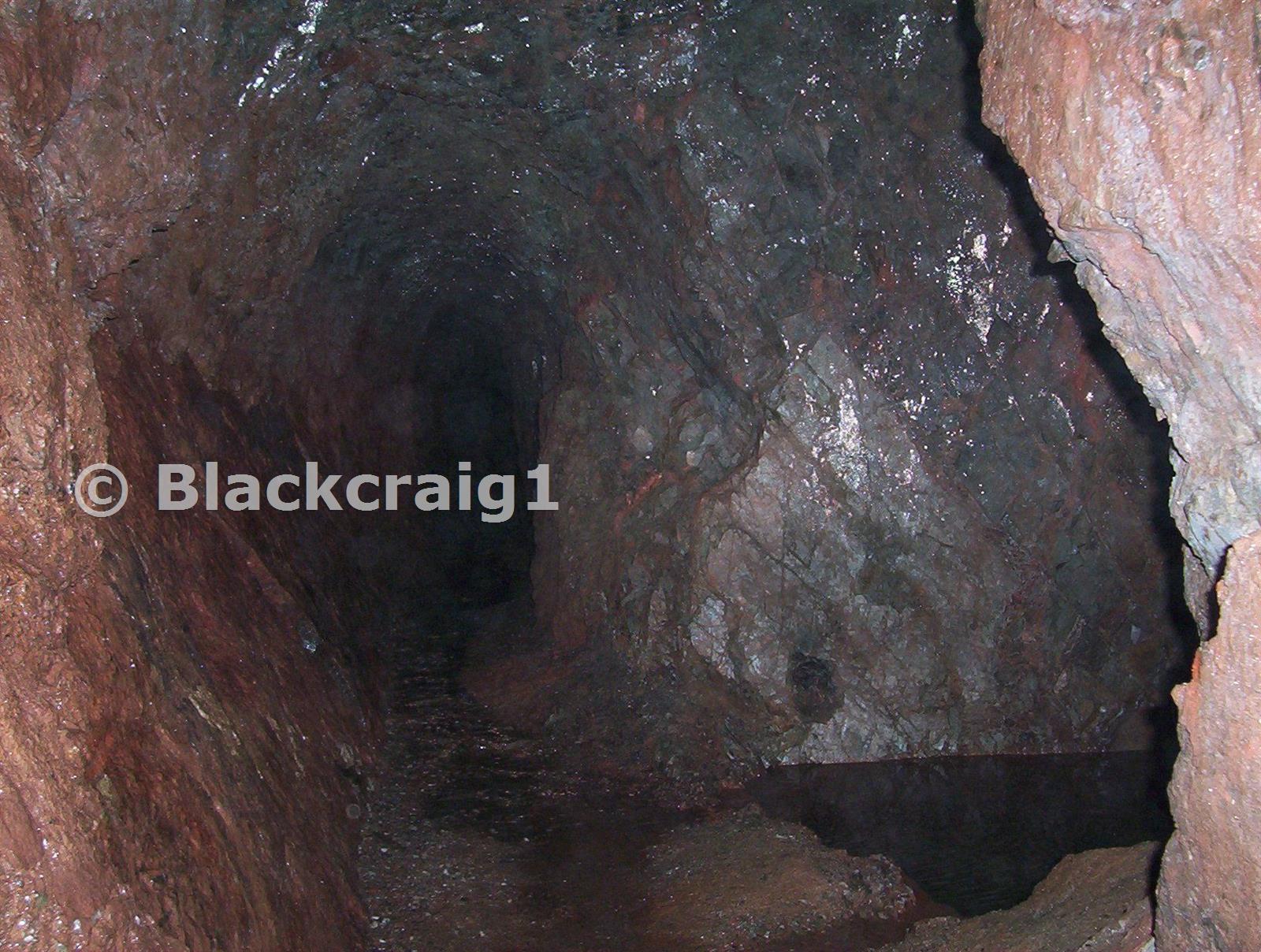 Flooded sump inside the level, it plumbed at 4.9m deep. The red staining would suggest iron is present, although what the miners were looking for was copper.