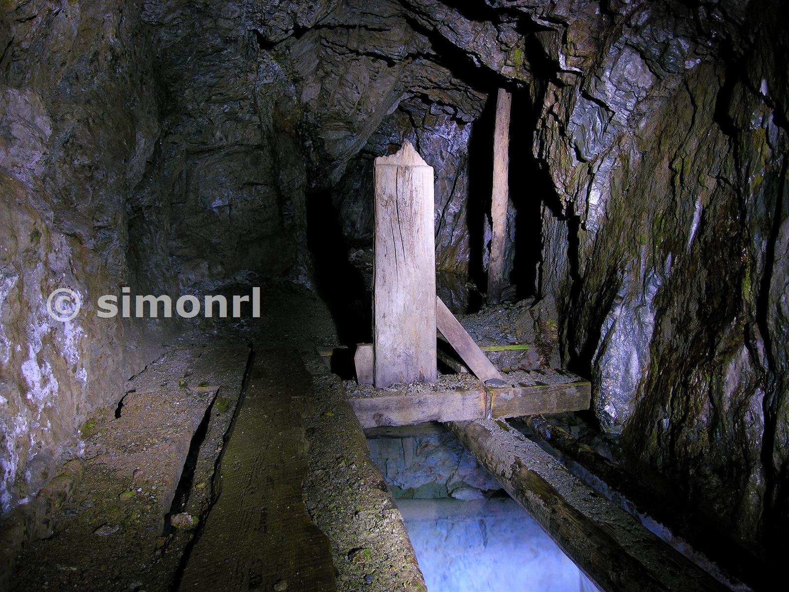 A view across a flooded winze at the shallow adit level; prompting the later realisation that part of the lower workings are flooded, and part are dry.