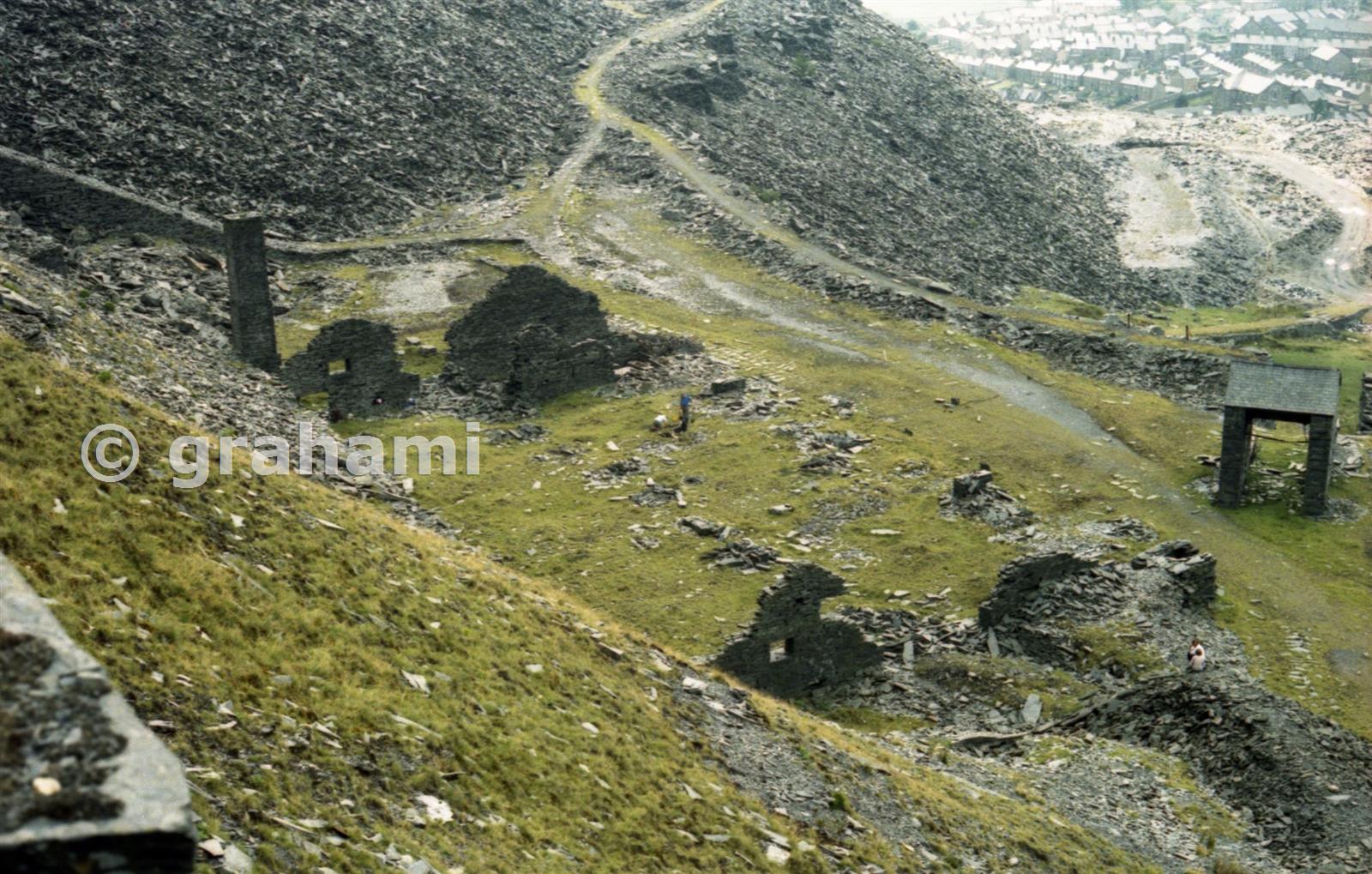 A general view of Floor 0 with the drumhouse of the incline down to the Office Floor on the right, and the Votty tip tramway (ca 1900) running in front (i.e. on the lip side of the tip) of the drumhouse and to the left. On the left is the foot of the last DIffwys Incline from Floor 5 down to Floor 0